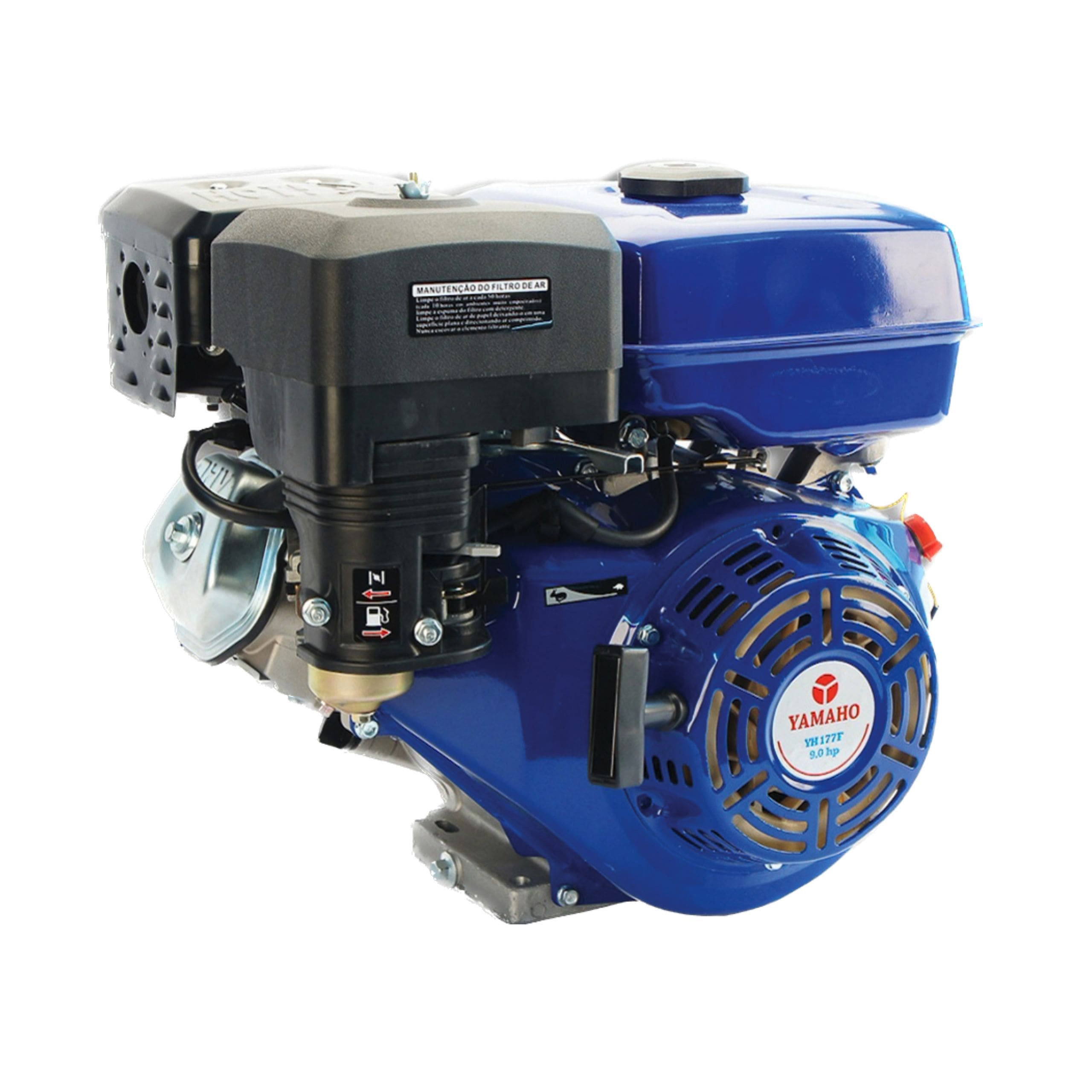Motor monocilíndrico a gasolina 4 tempos, com cilindrada de 212 cc e com 9 hp de potência.